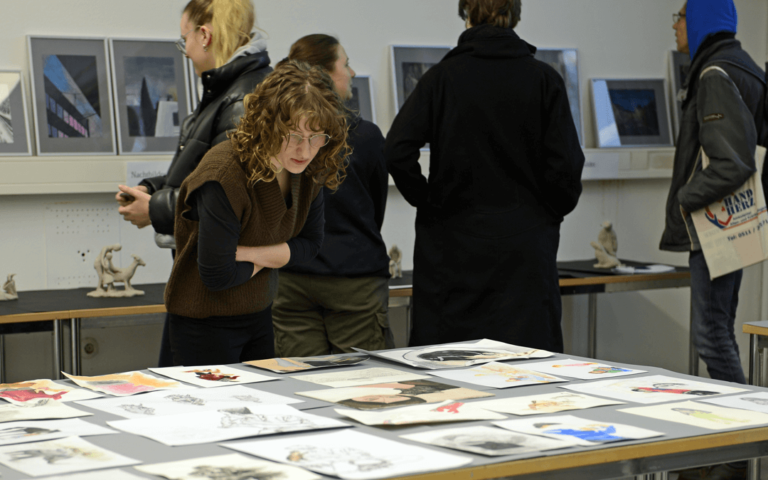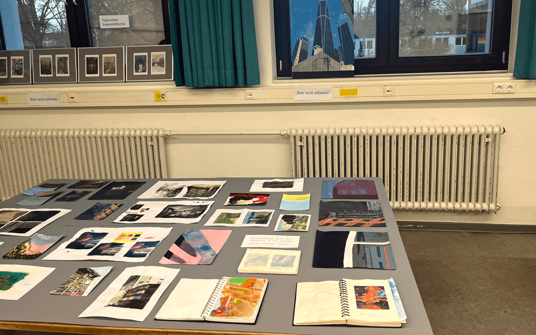 Die Kunstkurse der Jahrgänge 12, 13 und der E-Phase präsentierten zum Jahreswechsel ihre besten Werke. In den Fluren und im Kunstraum konnten die Mitschüler*innen Tonskulpturen von „Mensch und Tier“, verschiedene Tierarten in Bewegung oder „Architekturdarstellung zu verschiedenen Tageszeiten“ bewundern.