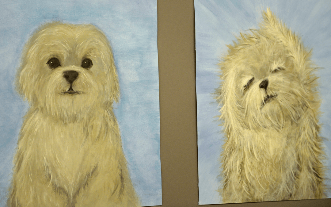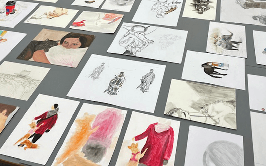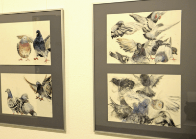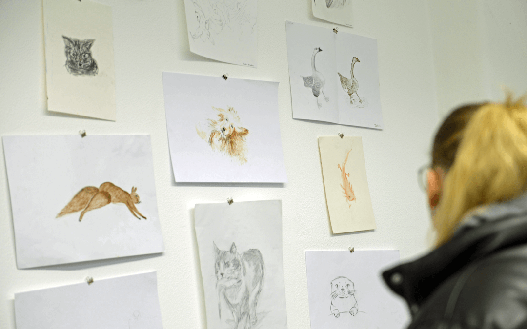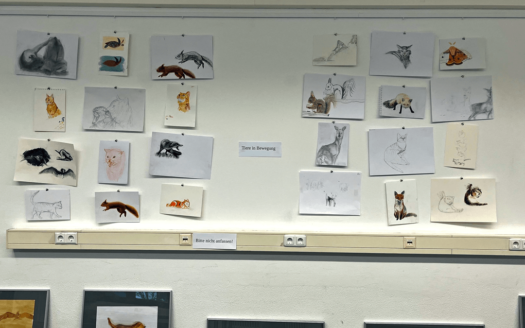 Im Schulflur ist es bunt und lebendig. Hunde, Katzen, Tauben, Kraniche, Pinguine, Meeresschildkröten oder Quallen sind nur einige der Tierarten, die im Gebäude ausnahmsweise nicht unter das Haustierverbot fallen. Ihre grazilen und realitätsgetreuen Bewegungen haben die Schüler*innen der Kunstkurse mit Tusche, Ölkreide, Buntstiften oder Acrylfarbe abgebildet. Beeindruckende Bilder von „Tieren in Bewegung“, die der Schulgemeinschaft zeigen, wie viel Arbeit bei aller Kreativität in jedem einzelnen Werk steckt.