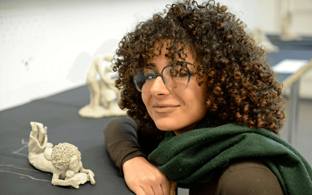 Luise hat eine besondere Erinnerung in Ton festgehalten. Sie konnte während ihrer Arbeit im Zoo Hannover hinter die Kulissen des Elefantenhauses schauen. Fast kaum sichtbar wird ihre Hand vom Rüssel eines Elefanten umschlungen. Zart und behutsam, trotz der Kraft, die in ihm steckt. Der massige Körper war eine „riesige Herausforderung“, betont die Schülerin. Anders als bei Menschendarstellungen sei es bei Tieren ungewohnt, Muskeln, Bauch und Falten oder die Proportionen realistisch abzubilden.