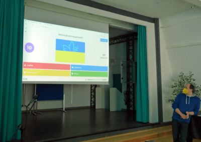 Beim digitalen Ukraine-Quiz in der Aula konnten die Schüler*innen ihr Wissen testen. Die engen Wirtschaftsverbindungen zwischen der Russischen Föderation und der Ukraine wurden deutlich, aber auch die Nähe des Kriegsgeschehens: Kiew liegt nur zweieinhalb Flugstunden von Hannover entfernt. Krim, Donbass oder Odessa waren für viele schon mehr als geographische Namen. Für die drei besten „Ukraine-Kenner“ auf dem Siegertreppchen gab es viel Applaus. Im Workshop „Erzwungene Migration“. Nutzten andere Schüler*innen die Gelegenheit, sich – trotz der bedrückenden Thematik – in kreativen Collagen mit Fluchterfahrungen auseinanderzusetzen.
